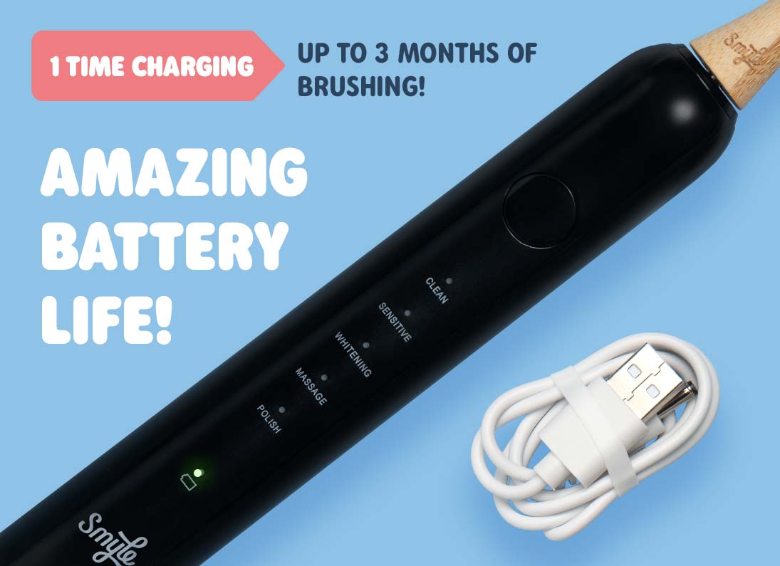 Erlebe den einzigartigen Smyle-Akku, der 120 Tage mit einer einzigen Ladung hält – nur 3 Ladevorgänge pro Jahr. Genieße langanhaltende Power, unkompliziertes Zähneputzen und das hochwertige Design von Smyle. Nie mehr so oft aufladen.